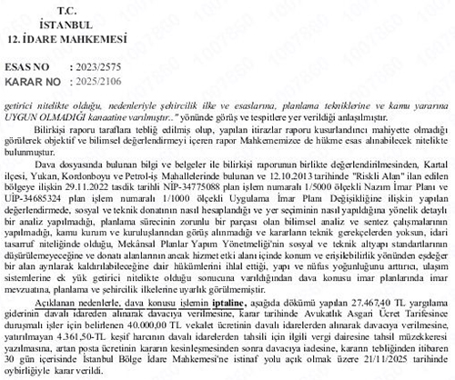 Sosyal medya hesabından konuyla ilgili açıklama yapan Haydar Göksoy “ Kartal ilçemiz Yukarı Mahalle, Kordonboyu Mahallesi ve Petrol-İş Mahallesi’nde yer alan riskli alana ilişkin; Çevre, Şehircilik ve İklim Değişikliği Bakanlığımızca 29.11.2022 tarihinde onaylanan 1/5000 ölçekli Nazım İmar Planı ile 1/1000 ölçekli Uygulama İmar Planı (ETAP 1 ve ETAP 2), mahkeme kararıyla iptal edilmiş ve Kartal Belediyesine tebliğ edilmiştir.