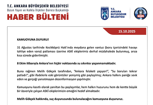 Buna rağmen Melih Gökçek tarafından, “Ankara felaketi yaşıyor!”, “Su boruları tekrar patladı!”, gibi ifadelerle eski görüntüler yeniymiş gibi paylaşılmış; Ankara halkını paniğe sevk eden ve gerçeği yansıtmayan dezenformasyon yapılmıştır.
