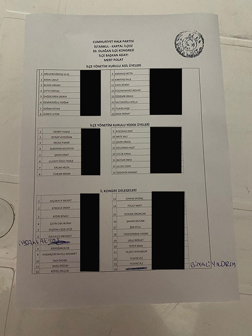 Bu gün mevcut ilçe Başkanı’nın tek adaylığıyla yapılan CHP Kartal İlçe Başkanlığı seçimlerinde, Belediye Başkanına tepki gösteren örgüt, ismini çizerek karşısına Binali Yıldırım yazdı.