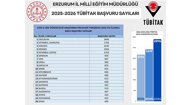 TÜBİTAK 2204-A Lise Öğrencileri Araştırma Projeleri Yarışması başvuru sonuçları açıklandı. 2025–2026 eğitim öğretim yılı kapsamında Açıklanan verilere göre Erzurum, 2896 proje başvurusu ile Türkiye genelinde birinci sırada yer alarak önemli bir başarıya imza attı.