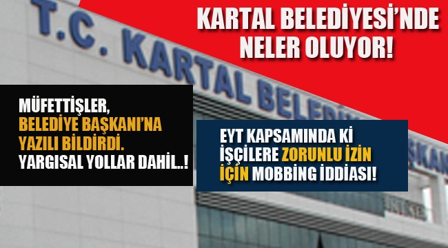 Kartal Belediyesi, son günlerde iki önemli olayla gündemde. “Belediye’nin İç Denetim Müfettişlerinin bir olayla ilgili Belediye Başkanı’na yazdığı yazı ve EYT kapsamında Belediye’de çalışan işçi personele “zorunlu izin” kullanmaları için Mobbing uygulanması olayı..