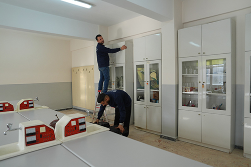 Okullarda devam eden çalışmalar kapsamında, sınıf ve ortak kullanım alanlarında bulunan dolap, raf, kitaplık, laboratuvar ekipmanları ve benzeri mobilyaların sabitlenmesi işlemleri; yapı güvenliği ve deprem mühendisliği kriterleri doğrultusunda gerçekleştiriliyor.