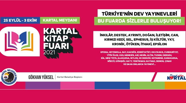 Kültür sanat çalışmaları kapsamında önemli atılımlara imza atan Kartal Belediyesi, 25 Eylül- 3 Ekim tarihleri arasında Kartal Meydanı’na kurulan dev fuar alanında düzenlenecek olan Kartal Kitap Fuarı’nı, kitap dostlarına açıyor. 100’e yakın yayınevinin katılımı ile gerçekleşecek olan kitap fuarında, 9 gün boyunca; söyleşi, imza günleri, konser ve kültür etkinliklerinde tanınmış onlarca şair, yazar, yayıncı ve sanatçı Kartallılar ile buluşacak.
