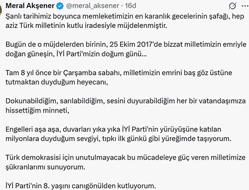 “Şanlı tarihimiz boyunca memleketimizin en karanlık gecelerinin şafağı, hep aziz Türk milletinin kutlu iradesiyle müjdelenmiştir. Bugün de o müjdelerden birinin, 25 Ekim 2017'de bizzat milletimizin emriyle doğan güneşin, İYİ Parti'mizin doğum günü... Tam 8 yıl önce bir Çarşamba sabahı, milletimizin emrini baş göz üstüne tutmaktan duyduğum heyecanı, Dokunabildiğim, sarılabildiğim, sesini duyurabildiğim her bir vatandaşımıza hissettiğim minneti, Engelleri aşa aşa, duvarları yıka yıka İYİ Parti'nin yürüyüşüne katılan milyonlara duyduğum sevgiyi, tıpkı ilk günkü gibi yüreğimde taşıyorum. Türk demokrasisi için unutulmayacak bu mücadeleye güç veren milletimize şükranlarımı sunuyorum. İYİ Parti'nin 8. yaşını canıgönülden kutluyorum.” İfadelerini kullandı