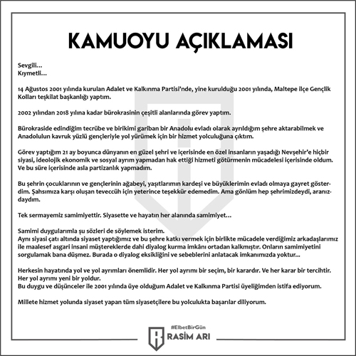 31 Mart yerel seçimlerinde AKP'den Nevşehir Belediye Başkanı seçildikten sonra geçmiş döneme dair yolsuzluk itiraflarıyla gündeme gelen ve geçtiğimiz ocak ayında sağlık nedenlerini gerekçe göstererek belediye başkanlığından istifa eden Rasim Arı AKP üyeliğinden de ayrıldığını açıkladı.