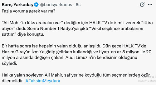 Yarkadaş sosyal medya hesabından yaptığı paylaşımda da Ali Mahir Başarir’ın lüks arabaları var” dediğim için Hlak Tv’de isim vererek “iftira atıyor” dedi. Sonra Number 1 Radyo’ya çıkıp “Vekil seçildikten sonra arabalarımı sattım” dedi.